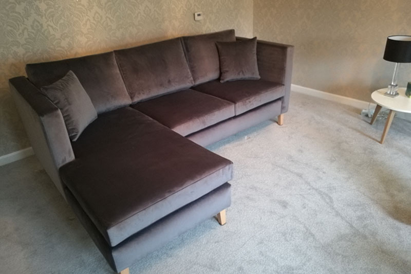 Our Houston sofa is a custom-built classic 3 seater sofa combined with 2 contemporary square-shaped arms. A chaise has also been added to the left hand looking side of the sofa, perfect for putting your feet up and relaxing after a long hard week. Top-quality, resilient, reflex foam seat cushions and fibre back cushions maximise the comfort and durability of the sofa, with matching scatter cushions added in to create uniformity. Upholstered in a stunning charcoal velvet fabric and finished off with beautifully stained light oak wooden feet.
